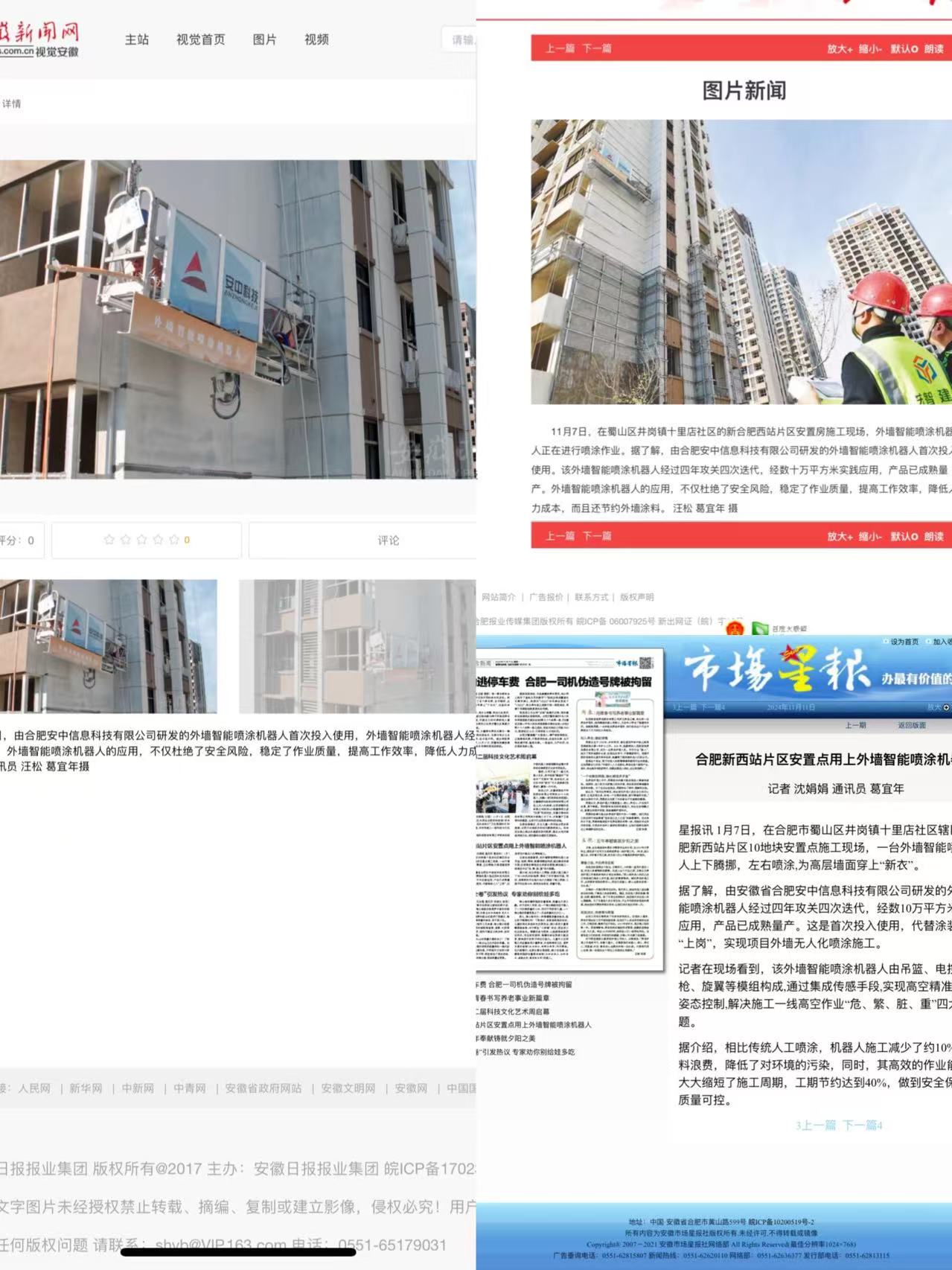 2024年9月,我司产品外墙智能喷涂机器人在合肥市新西站片区09.11.13地块安置点工程参与外墙涂料施工,彻底展现了外墙智能喷涂机器人高效,安全,节约成本以及施工质量方面的优势,与人工喷涂质量相比更胜一筹,得到业主,监理及总包方一致好评。此次施工也吸引了众多行业内人士的关注与青睐,多家媒体更是对此次施工给予了充分报到,更加表明了我司外墙智能喷涂机器人已成功的应用到实际施工作业当中,为智能建筑发展带来新的动力。也为我司未来进一步完善产品提供了更多数据支撑。