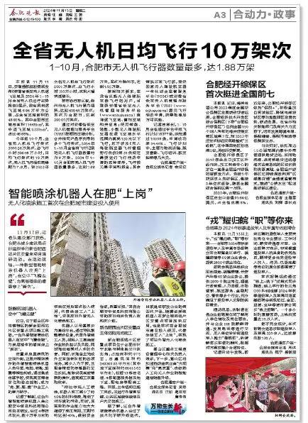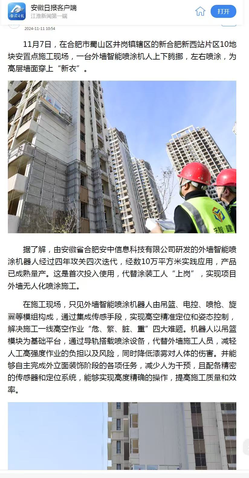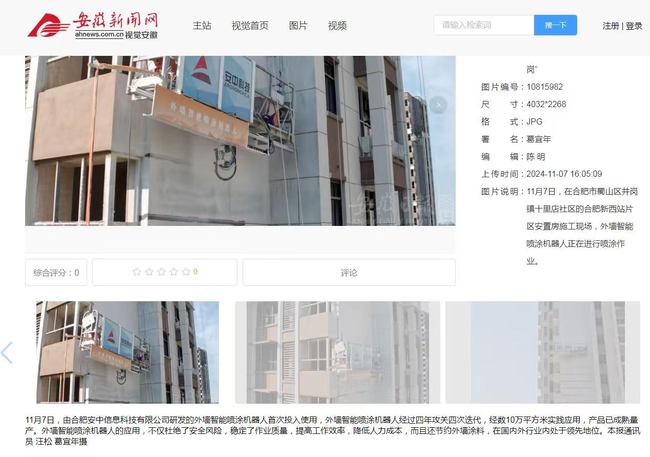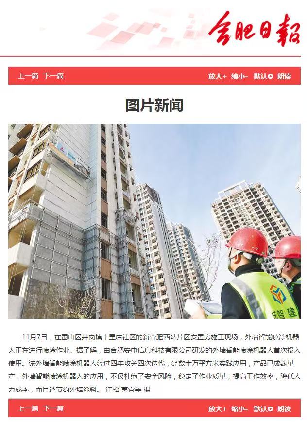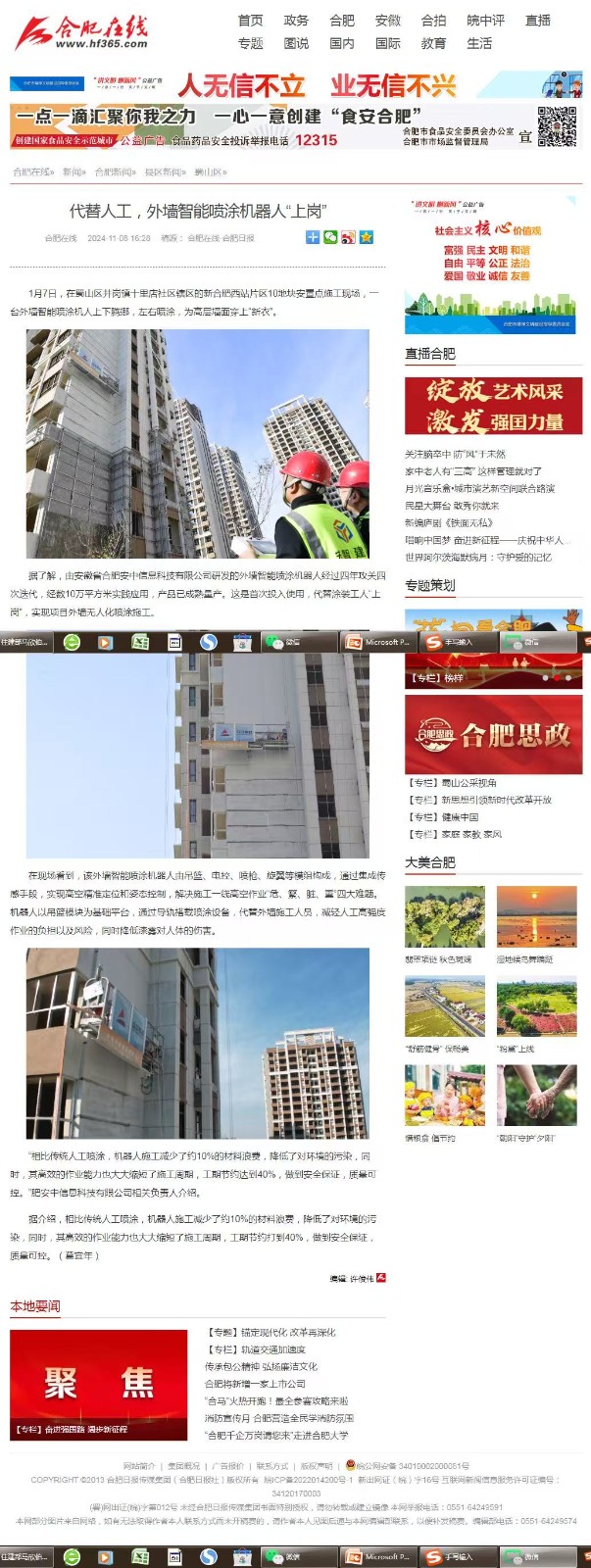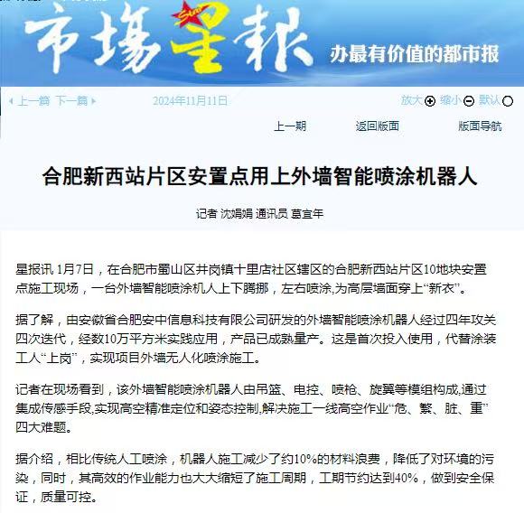1.2024年11月17日《安徽日报》、《安徽新闻网》、《合肥晚报》、《合肥政务网》、《合肥日报》、《合肥在线》、《市场星报》在合肥市蜀山区井岗镇辖区的新合肥西站片区安置点施工现场对我司外墙智能喷涂机器人施工进行了报道。报道指出我司外墙智能喷涂机器人的应用解决了施工一线高空作业“危、繁、脏、重”四大难题。不仅杜绝了安全风险,稳定了作业质量,提高工作效率,降低人力成本,而且还节约外墙涂料,在国内外行业内处于领先地位。