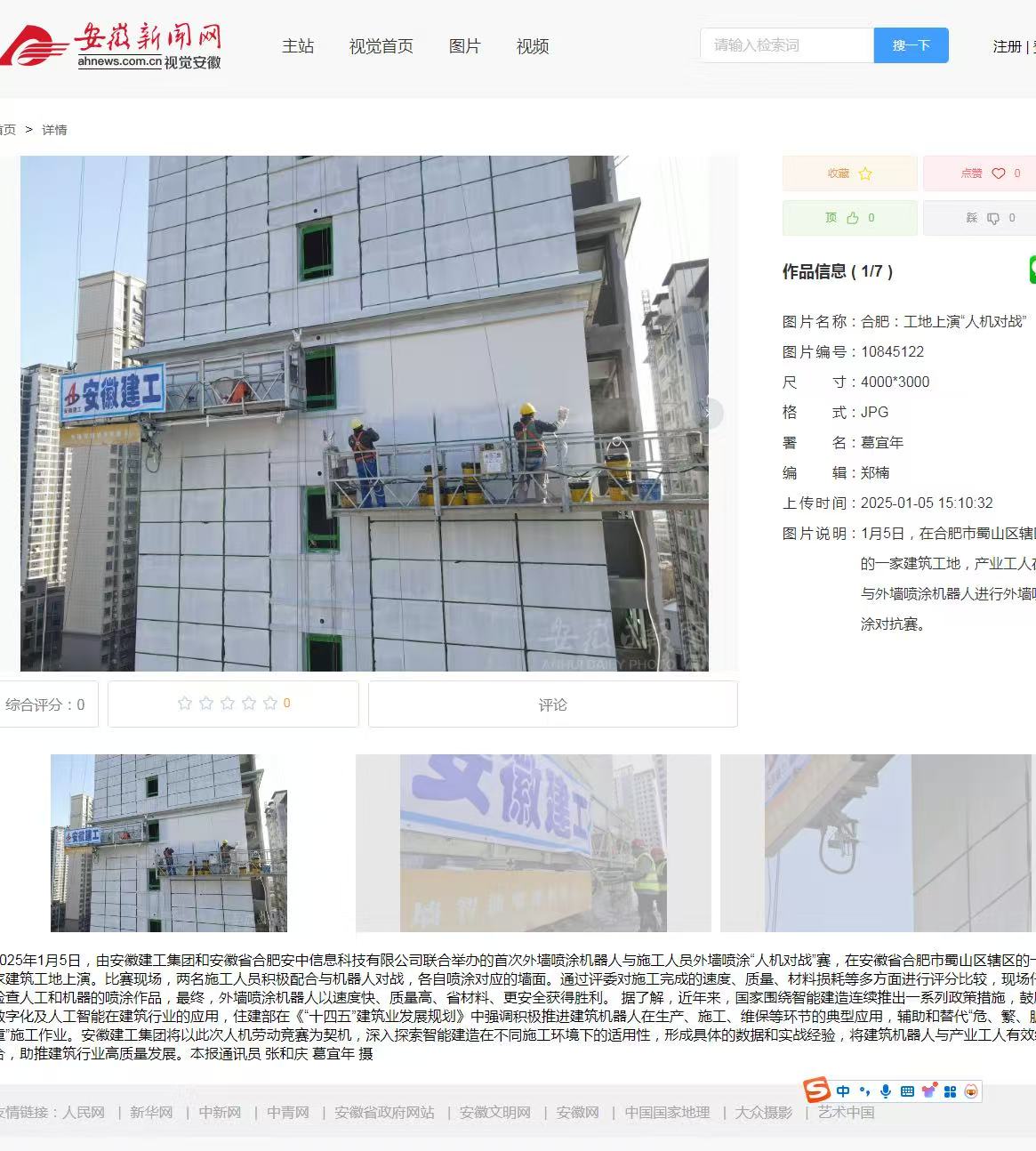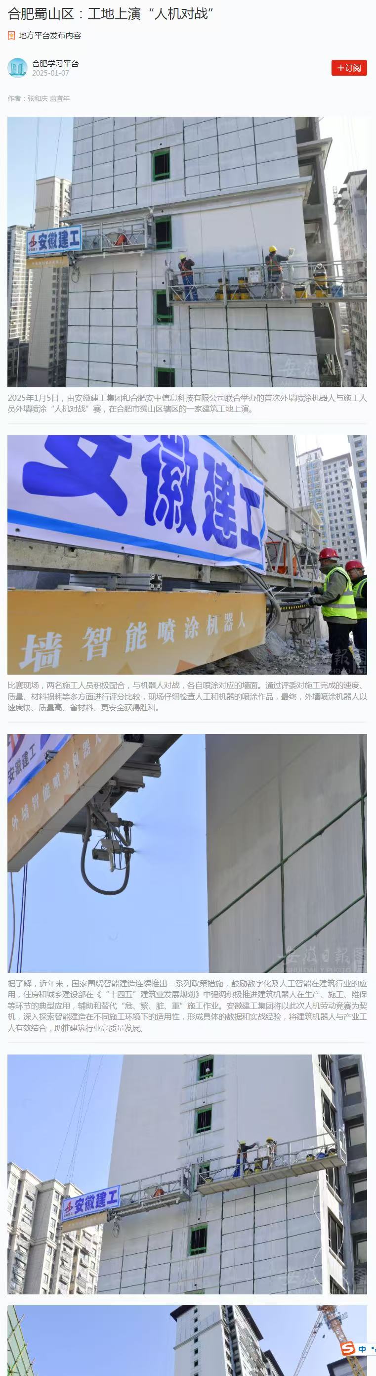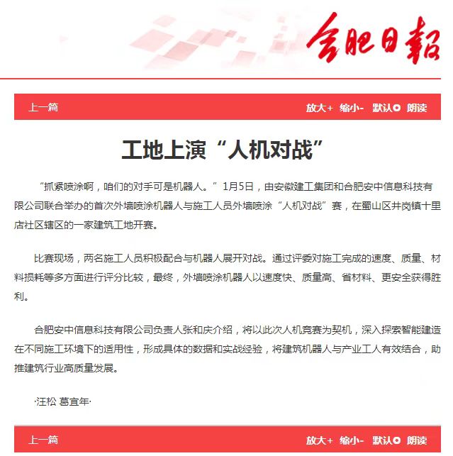 2025年1月5日,《安徽新闻网》、《合肥日报》、《合肥学习平台》等媒体对我司和安徽建工集团联合举办的首次外墙喷涂机器人与施工人员外墙喷涂‘人机大赛’进行了报道,报道称此次人机大赛深入探索智能建造在不同施工环境下的适用性,形成具体的数据和实战经验,将建筑机器人与产业工人有效,助推建筑行业高质是发展。